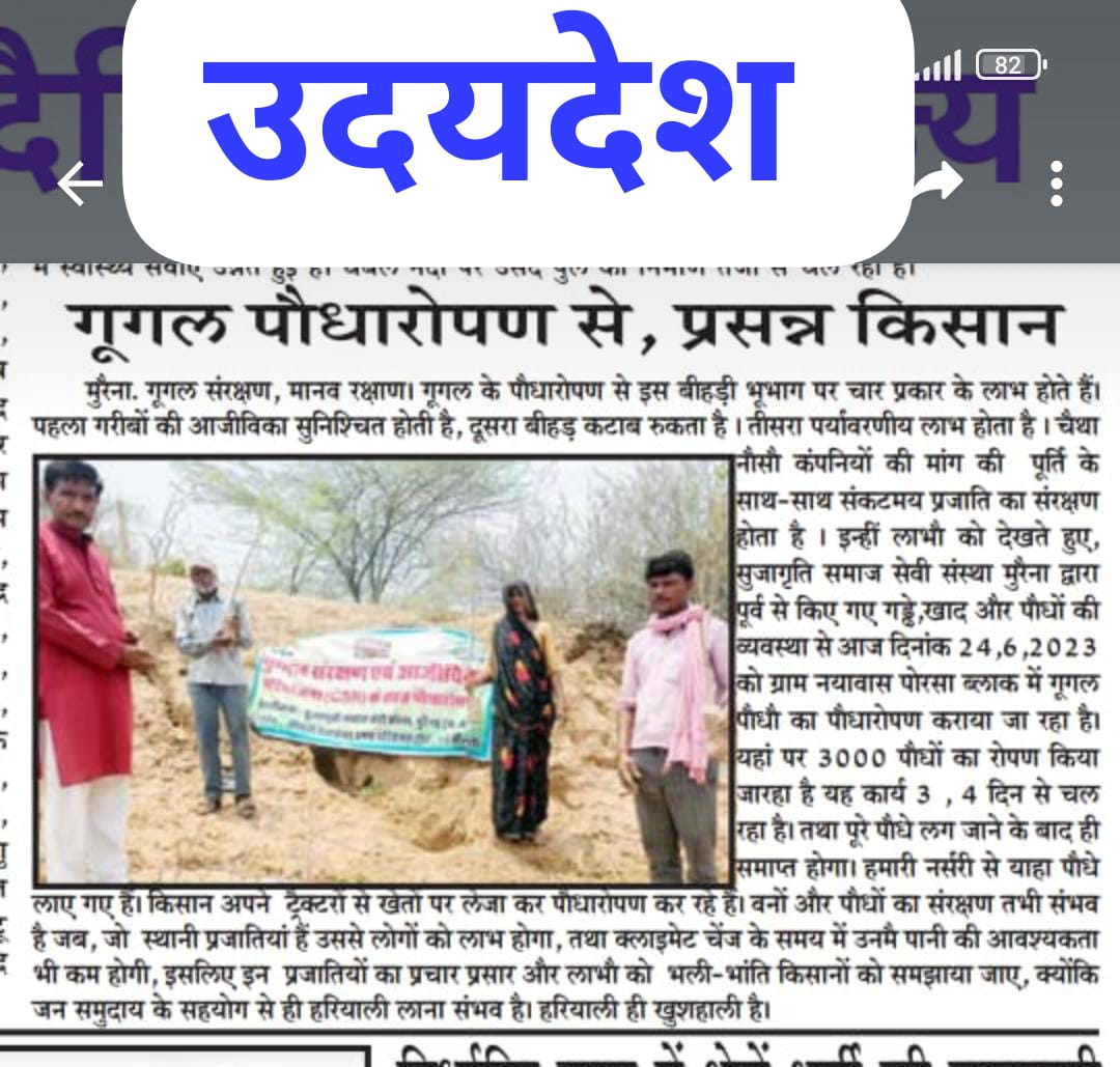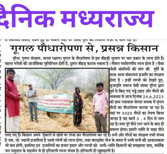गूगल संरक्षण, मानव रक्षाण। गूगल के पौधारोपण से इस बीहड़ी भूभाग पर चार प्रकार के लाभ होते हैं। पहला गरीबों की आजीविका सुनिश्चित होती है, दूसरा बीहड़ कटाब रुकता है । तीसरा पर्यावरणीय लाभ होता है । चौथा नौसौ कंपनियों की मांग की पूर्ति के साथ-साथ संकटमय प्रजाति का संरक्षण होता है । इन्हीं लाभौ को देखते हुए, सुजागृति समाज सेवी संस्था मुरैना द्वारा पूर्व से किए गए गड्ढे,खाद और पौधों की व्यवस्था से आज ग्राम नयावास पोरसा ब्लाक में गूगल पौधौ का पौधारोपण कराया जा रहा है। यहां पर 3000 पौधों का रोपण किया जारहा है यह कार्य 3 , 4 दिन से चल रहा है। तथा पूरे पौधे लग जाने के बाद ही समाप्त होगा। हमारी नर्सरी से याहा पौधे लाए गए हैं। किसान अपने ट्रैक्टरों से खेतों पर लेजा कर पौधारोपण कर रहे हैं। वनों और पौधों का संरक्षण तभी संभव है जब, जो स्थानी प्रजातियां हैं उससे लोगों को लाभ होगा, तथा उनमै पानी की आवश्यकता भी कम होगी, इसलिए इन प्रजातियों का प्रचार प्रसार और लाभौ को भली-भांति किसानों को समझाया जाए, क्योंकि जन समुदाय के सहयोग से ही हरियाली लाना संभव है। हरियाली ही खुशहाली है।