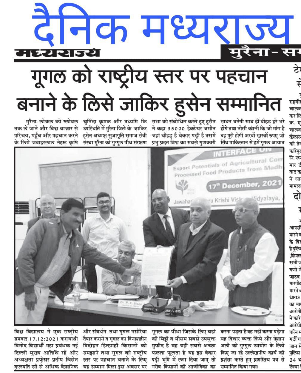 लोकल को ग्लोबल तक ले जाने और विश्व बाज़ार से परिचय, पहुँच और पहचान करने के लिये जवाहरलाल नेहरू कृषि विश्व विद्यालय ने एक राष्ट्रीय समवाद १७ः१३ः२०२१ कराया इस महत्वपूर्ण कार्यक्रम मध्य प्रदेश के किसानो को exporter बनने के लिए मार्ग प्रशस्त करना था। श्री विनोद विद्यार्थी महा प्रबंधक APEDA नई दिल्ली मुख्य अतिथि रहें और अध्यक्षता प्रफ़ेसर प्रदीप बिसेन कुलपति JNKVV थे सौ से अधिक वैज्ञानिक, startups, FPOs, चुनिंदा कृषक और उध्यमि कि उपस्थिति में मुरैना जिले के श्री ज़ाकिर हूसेन अध्यक्ष सुजागृति समाज सेवी संस्था मुरैना को गुग्गुल पौध संरक्षण और संवर्धन तथा गूगल नर्सरिया तैयार कराने व गूगल का विनाशहीन विदोहन हितग्राही किसानों को समझाने तथा गूगल को राष्ट्रीय स्तर पर पहचान बनाने के लिए यह सम्मान मिला इस अवसर पर सभा को संबोधित करते हुए हुसैन ने कहा 35000 हेक्टेयर जमीन जहां बीहड़ है बेकार पड़ी है उसमें प्रभु प्रदत विश्व का सबसे गुणकारी गूगल का पौधा जिसके लिए यहां की मिट्टी व मौसम सबसे उपयुक्त मुफीद है वह यही सबसे अच्छा फलता फूलता है यह इस बेकार पड़ी भूमि में लगा दिया जाए तो गरीब किसानों की आजीविका का साधन बनेगी साथ ही बीहड़ हरे भरे होंगे तथा नोसौ कंपनी कि जो मांग है वह पूरी होगी अरबों खरबों रुपए जो सिंध पाकिस्तान से हमें गूगल आयात करना पड़ता है वह नहीं करना पड़ेगा यह विचार व्यक्त किये और ऐशान अली को गुग्गुल उधयोग के लिये किए जा रहे उल्लेखनीय कार्य की प्रशंसा करते हुए प्रशस्तिय पत्र से सम्मानित किया गया।