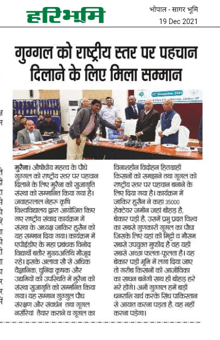 सौ से अधिक वैज्ञानिक, startups,FPOs, चुनिंदा कृषक और उध्यमि कि उपस्थिति में मुरैना जिले के श्री ज़ाकिर हूसेन अध्यक्ष सुजागृति समाज सेवी संस्था मुरैना को गुग्गुल पौध संरक्षण और संवर्धन तथा गूगल नर्सरिया तैयार कराने व गूगल का विनाशहीन विदोहन हितग्राही किसानों को समझाने तथा गूगल को राष्ट्रीय स्तर पर पहचान बनाने के लिए यह सम्मान मिला इस अवसर पर सभा को संबोधित करते हुए हुसैन ने कहा 35000 हेक्टेयर जमीन जहां बीहड़ है बेकार पड़ी है उसमें प्रभु प्रदत विश्व का सबसे गुणकारी गूगल का पौधा जिसके लिए यहां की मिट्टी व मौसम सबसे उपयुक्त मुफीद है वह यही सबसे अच्छा फलता फूलता है यह इस बेकार पड़ी भूमि में लगा दिया जाए तो गरीब किसानों की आजीविका का साधन बनेगी साथ ही बीहड़ हरे भरे होंगे तथा नोसौ कंपनी कि जो मांग है वह पूरी होगी अरबों खरबों रुपए जो सिंध पाकिस्तान से हमें गूगल आयात करना पड़ता है वह नहीं करना पड़ेगा यह विचार व्यक्त किये और ऐशान अली को गुग्गुल उधयोग के लिये किए जा रहे उल्लेखनीय कार्य की प्रशंसा करते हुए प्रशस्तिय पत्र से सम्मानित किया गया।