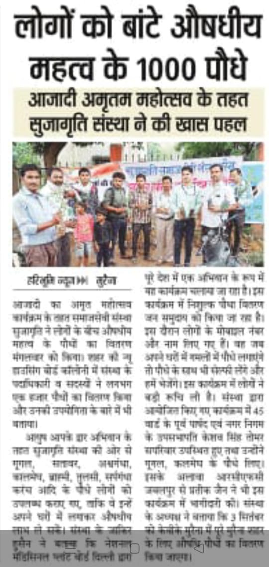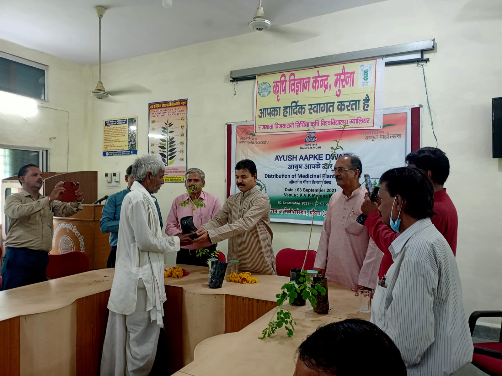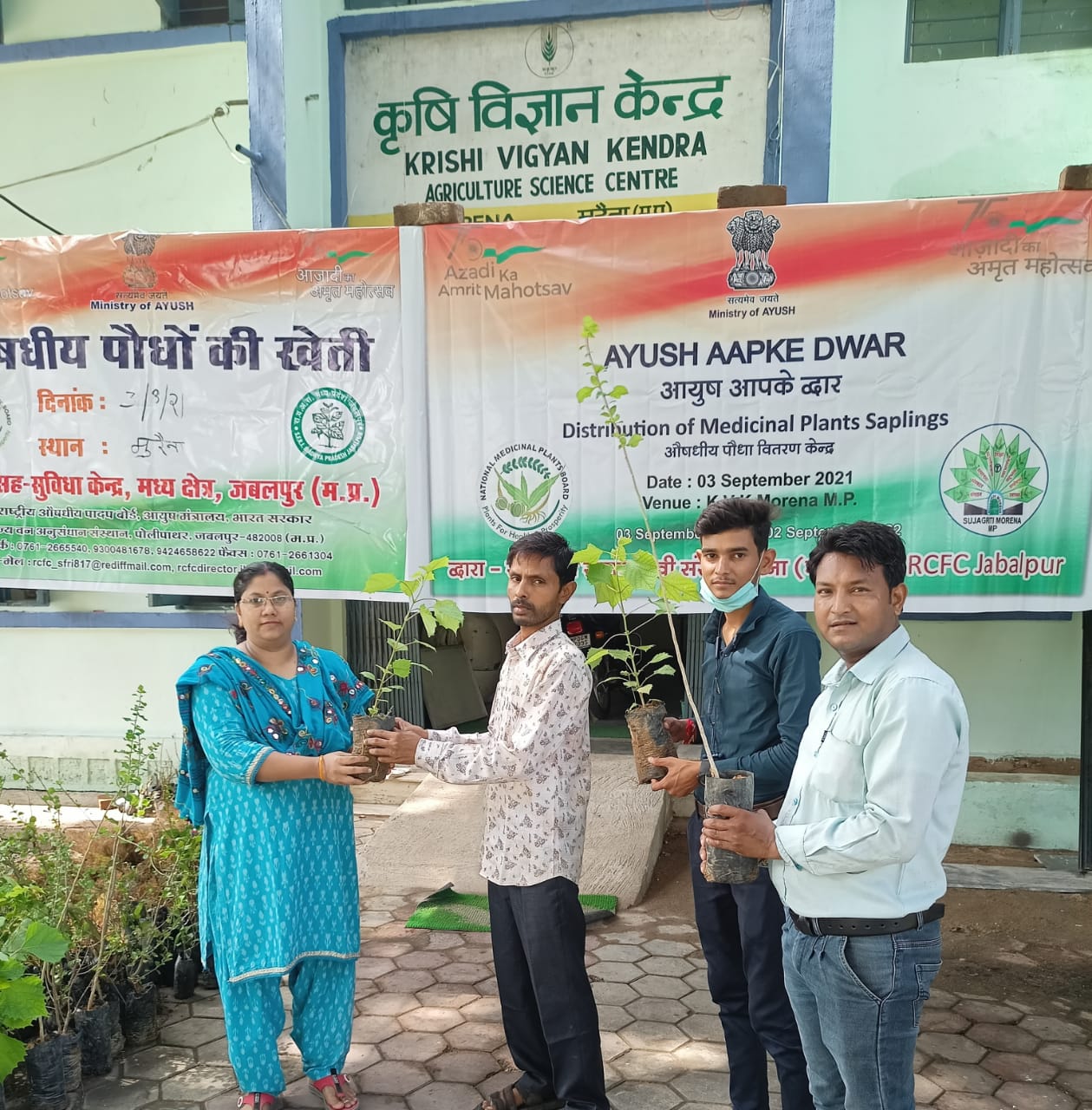 आजादी का अमृत महोत्सव कार्यक्रम के अंतर्गत आयुष आपके द्वार के तहत सुजागृति समाज सेवी संस्था मुरैना एवं आरसीएफसी जबलपुर के संयुक्त तत्वाधान में औषधि पौधा वितरण कार्यक्रम न्यू हाउसिंग बोर्ड कॉलोनी में राम प्रसाद बिस्मिल चौराहे पर आयोजित किया गया जिसमें गूगल, सतावर, अश्वगंधा कालमेघ, ब्राह्मी,तुलसी सर्पगंधा करंचआदि के पौधे 1000 पौधों का वितरण किया गया जिससे औषधिय पौधे घर-घर लगाए जा सके तथा औषधियों का लाभ जन समुदाय ले सके इन पौधों को भी लोग पहचान सकै इसी उद्देश्य को लेकर नेशनल मेडिसिनल प्लांट बोर्ड दिल्ली द्वारा पूरे देश में एक अभियान के रूप में यह कार्यक्रम चलाया जा रहा है इस कार्यक्रम में निशुल्क पौधा वितरण जन समुदाय को किये जा रहा है इसमें लोगों के मोबाइल नंबर और नाम लिए गए हैं वह जब अपने घरों मैं गमलों में पौधे लगाएंगे उस समय पौधे के साथ सेल्फी लेंगे और हमें डालेंगे इस तरीके से फॉलोअप कार्यक्रम भी होगा इस कार्यक्रम में लोगों ने बड़ी रूचि ली है 45 वार्ड के पार्षद एव नगर निगम के उपसभापति श्री केशव सिंह तोमर मय फैमिली के उपस्थित हुए तथा उन्होंने गूगल कलमेघ के पौधे लिए सुजागृति संस्था अध्यक्ष द्वारा लोगों को पौधों के विषय में उनके नाम तथा वह किस उपयोग में आते हैं वह बताया गया आरसीएफसी जबलपुर से श्री प्रतीक जैन ने भी इस कार्यक्रम में भागीदारी की 3 सितंबर 2021 को केवीके मुरैना में पूरे मुरैना शहर के लिए औषधि पौधों का वितरण किया जाएगा।